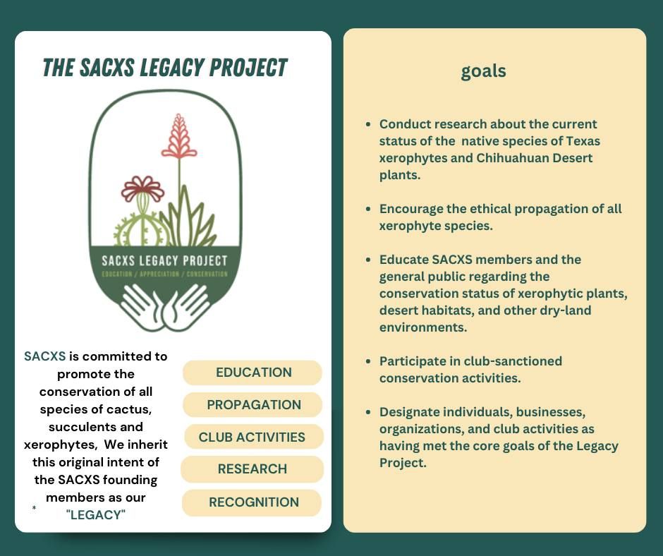 The Purpose of the SACXS Legacy Project is to update the goals of the original SACXS Mission through education and promotion of native and nonnative xerophyte species.